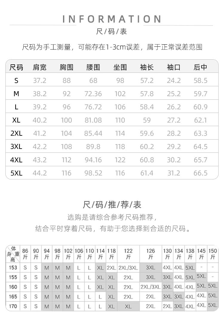 S size 全長:55 肩寬:37 袖長:55 胸寬:42 腰寬:38 M size 全長:56 肩寬:40 袖長:59 胸寬:46 腰寬:40 .商品尺寸測量值的誤差1~2公分視為合理範圍。 .Model:約身高 170 cm / 體重 50 kg / 三圍 33 24 34 .商品尺寸測量值的誤差1~2公分視為合理範圍。 .辦理商品退換貨時,商品如有贈品或配件,請務必一併寄回。 .商品圖檔顏色因電腦螢幕設定差異會略有不同,請參考近拍圖,商品以實際顏色為準,請見諒。 .依洗滌標示清洗